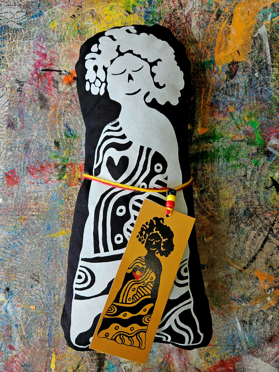 Our Mimi dolls are designed by Nagula Jarndu artists Rowena Morgan and Martha Lee, handprinted and sewn in Rubibi, Broome.