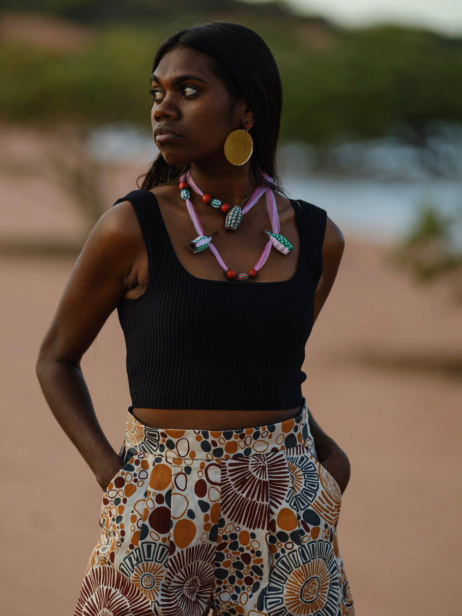 Beautiful colourful handprinted textiles and paper prints, soap, candles, tee shirts and earings. The colours and prints represent the feeling of country and dreaming. Very inspiring. Well done Nagula Jarndu ( Saltwater woman)