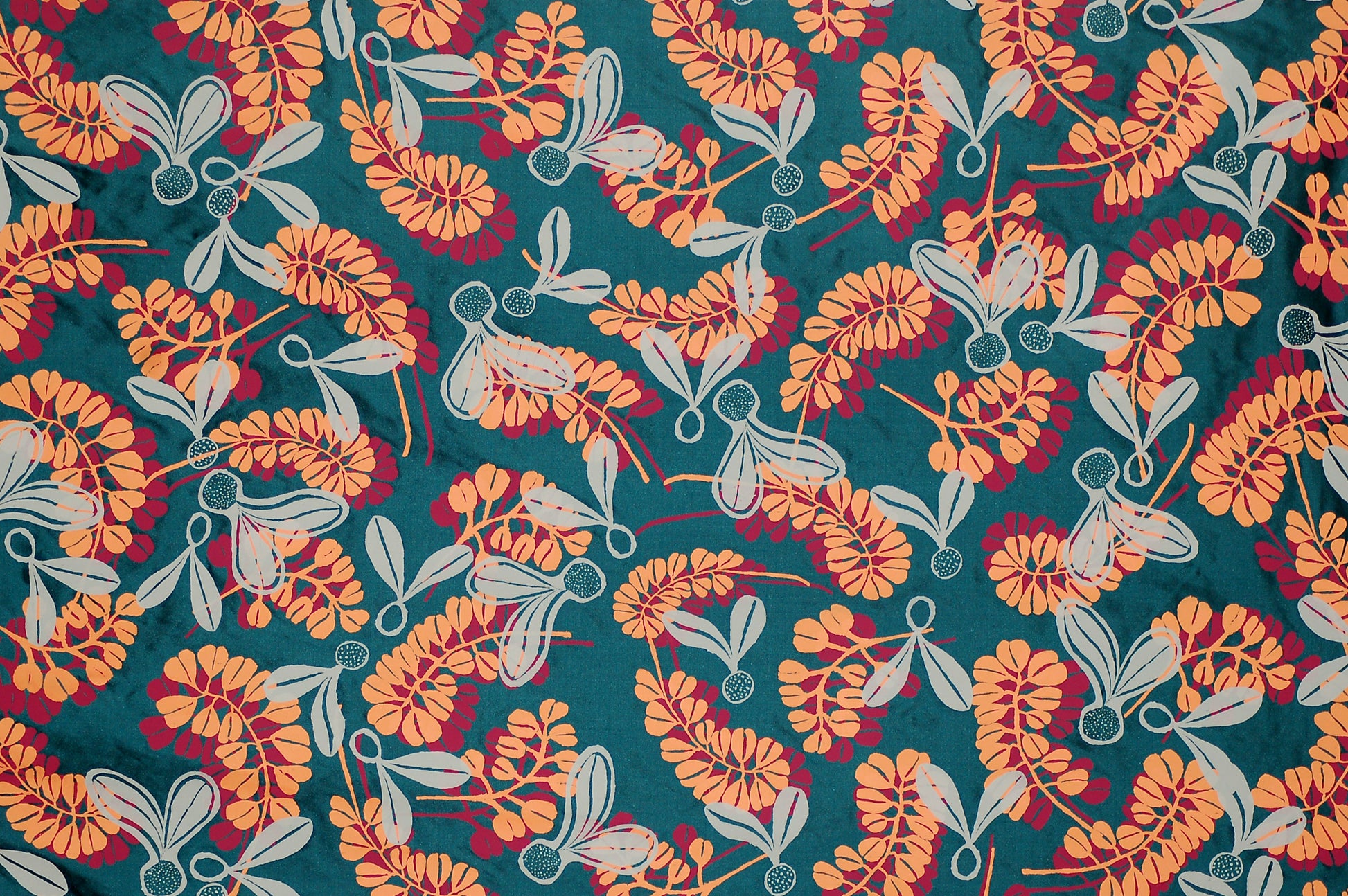 The base fabric is petrol blue and is a three-colour print with tangerine, magenta and light grey coloured details.
