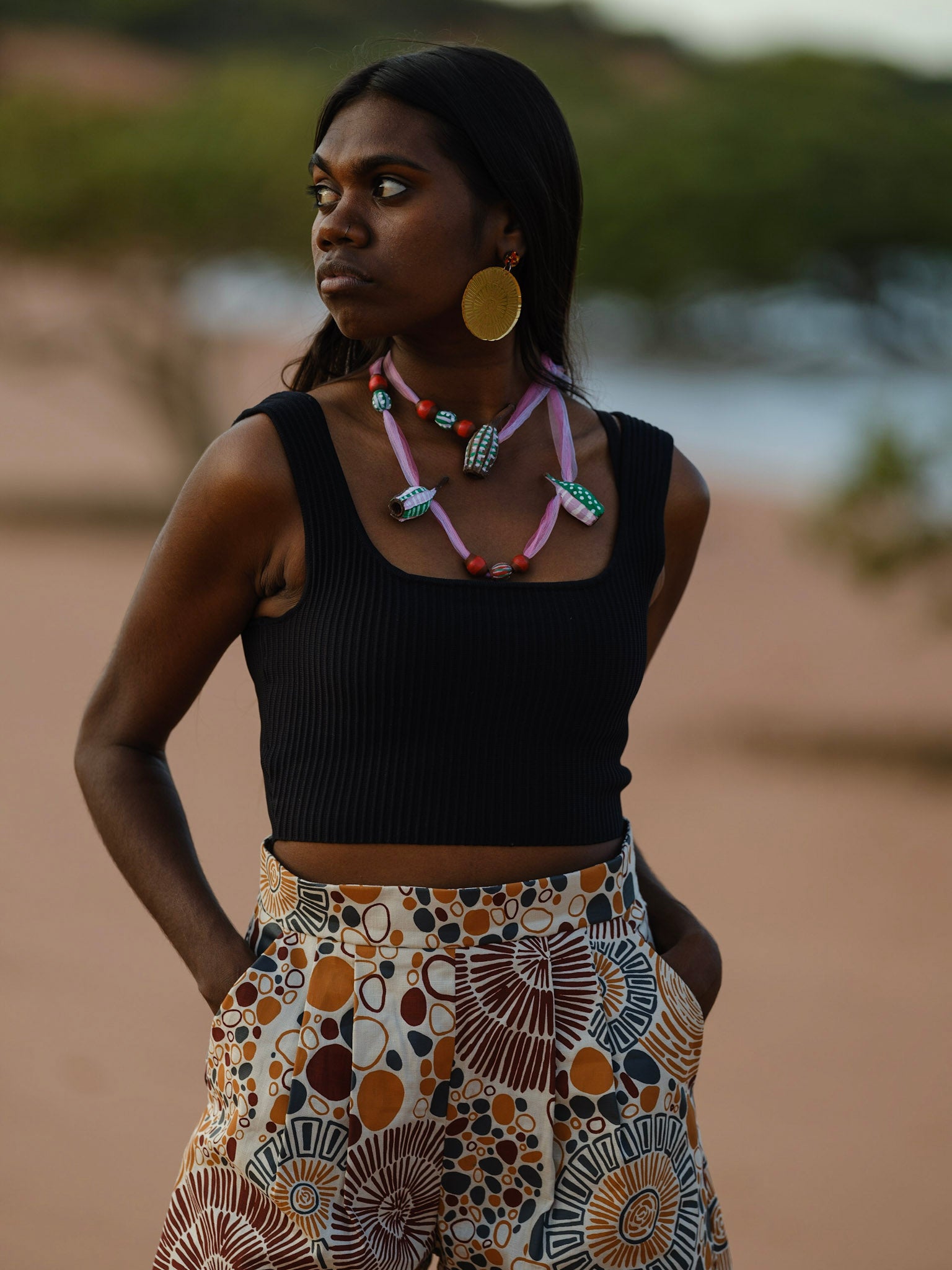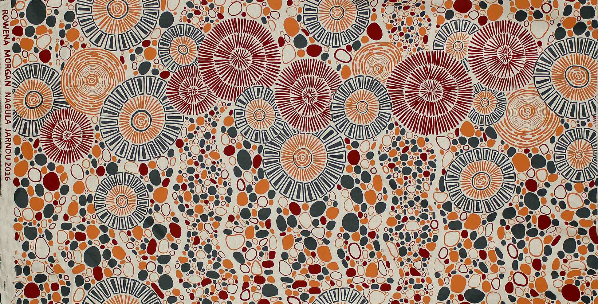 Rowena was born in Wyndham and grew up on Kija Country in Halls Creek. She remembers spending time as a child sitting down painting with her Grandmother who taught her about important Kija knowledge and the stories she should paint. This design shows the Hill Country of the Lansdowne Ranges and through her Grandmother, Rowena is the custodian of this country. Rowena's fabrics are highly sought after, particularly after winning the Indigenous Textile Artist of the year at the National Indigenous Fashion Awards in 2023.