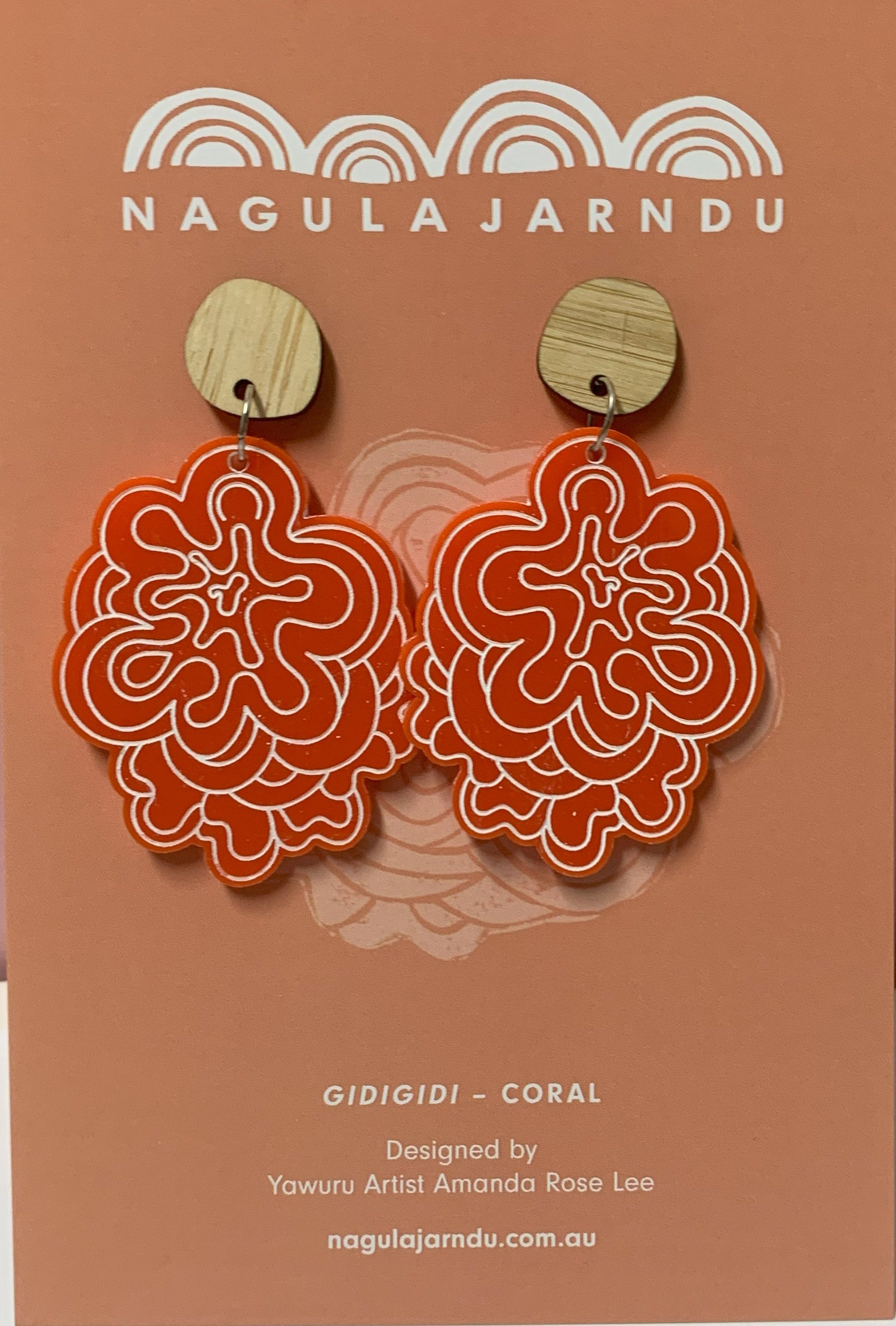 Amanda Rose is from Yawuru country and much of her designs reflect the sea country. This gidigidi (coral). earring is bright and bold.