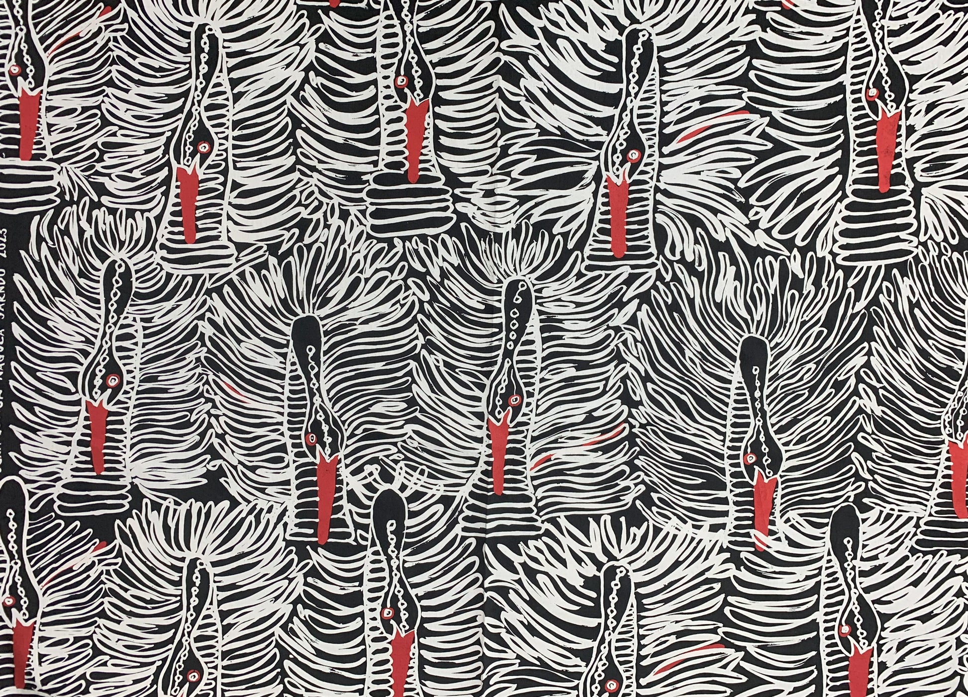 The base fabric is black and it is a two-colour print with off white and red details.