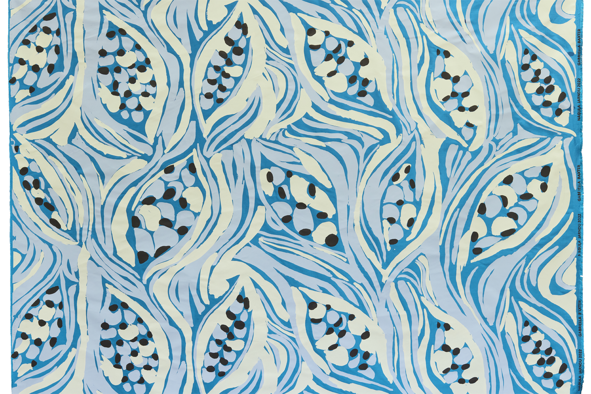 An opaque print with cream, blue and black details.