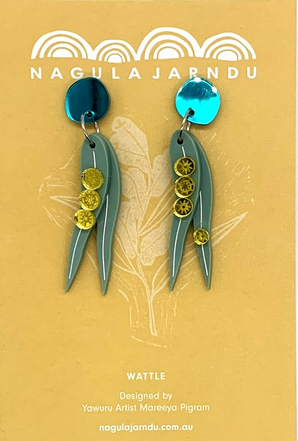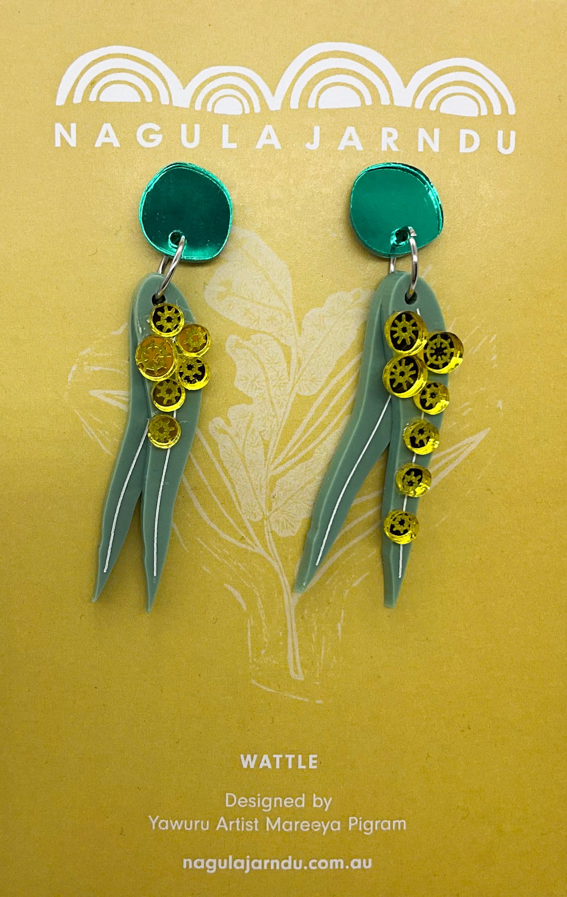 They measure approx. 6cm in length with sage green leaves with white painted details and a yellow mirror blossom embellishment. They have a green mirror top.