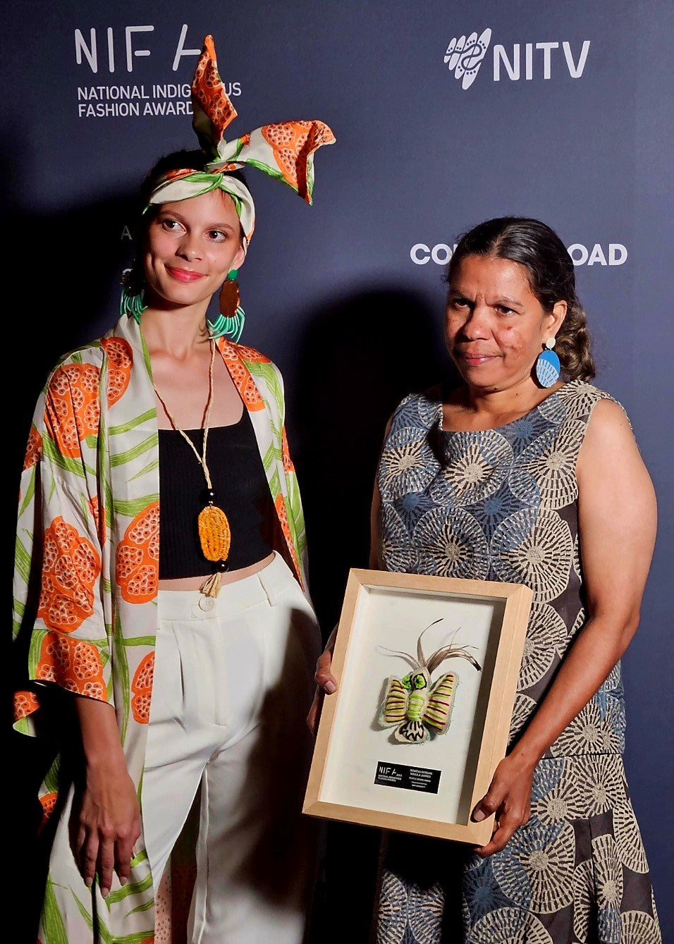 Rowena is a Kija artist from Halls Creek in the East Kimberley. Wirniny (pandanus) are an extremely useful and important plant for Indigenous people. The ripe red segments of the fruit can be roasted and eaten, and the white base of the leaves can also be eaten raw or cooked. The strong leaves of the wirniny are most notably used for clothing, hats, necklaces, mats, bags, baskets, ropes, twine, thatching and fishing. It also provides bush medicine-chewing the leaves to relieve sore throats, scabies, eye problems and pounded into a paste for use as an antiseptic ointment for wounds.