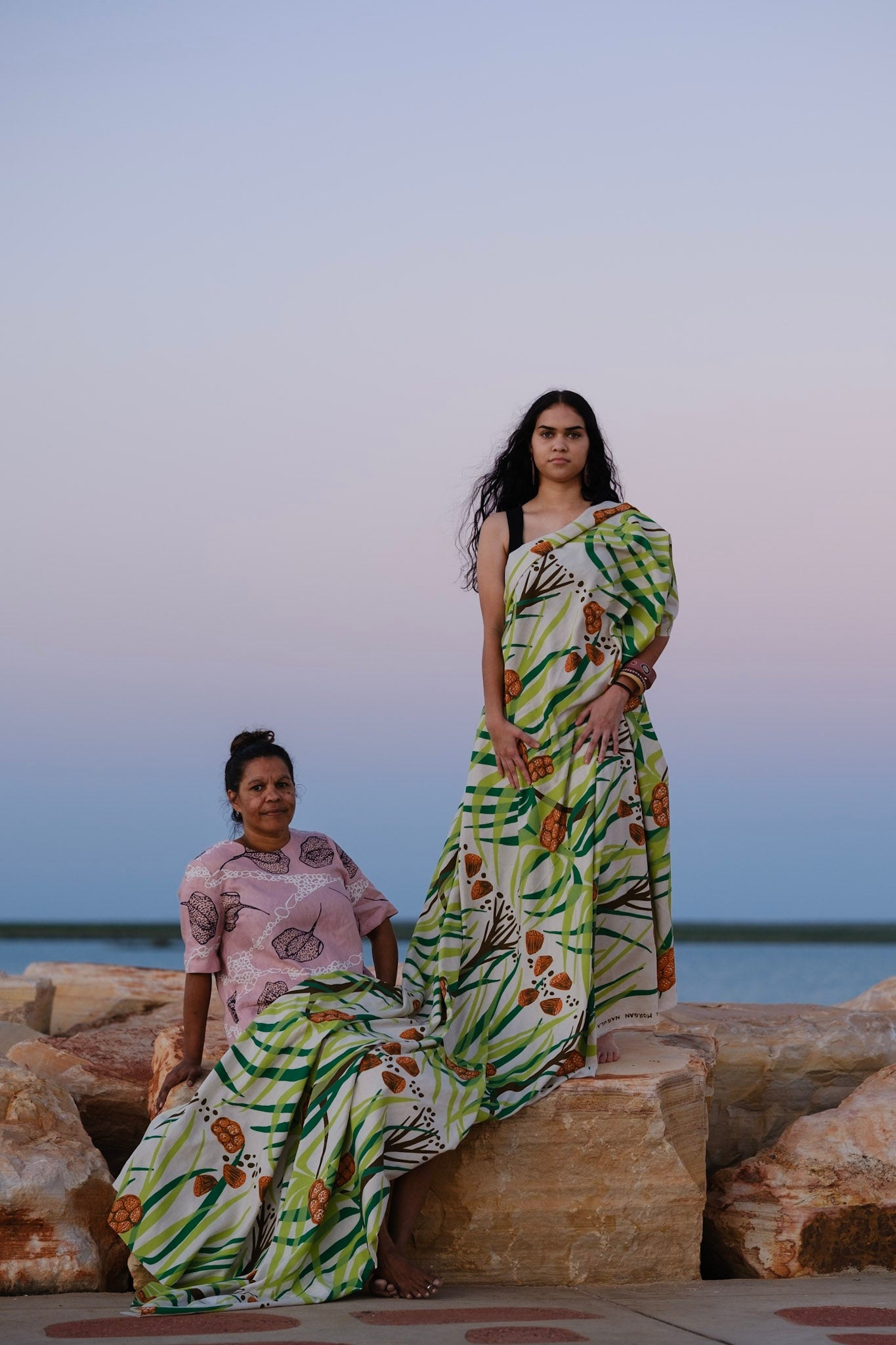 Founded in 1987 by Yawuru women as a way to preserve language and tradition, we have evolved into a vibrant arts and textiles business. Our name, meaning ‘saltwater women,’ reflects our deep connection to the land and sea.